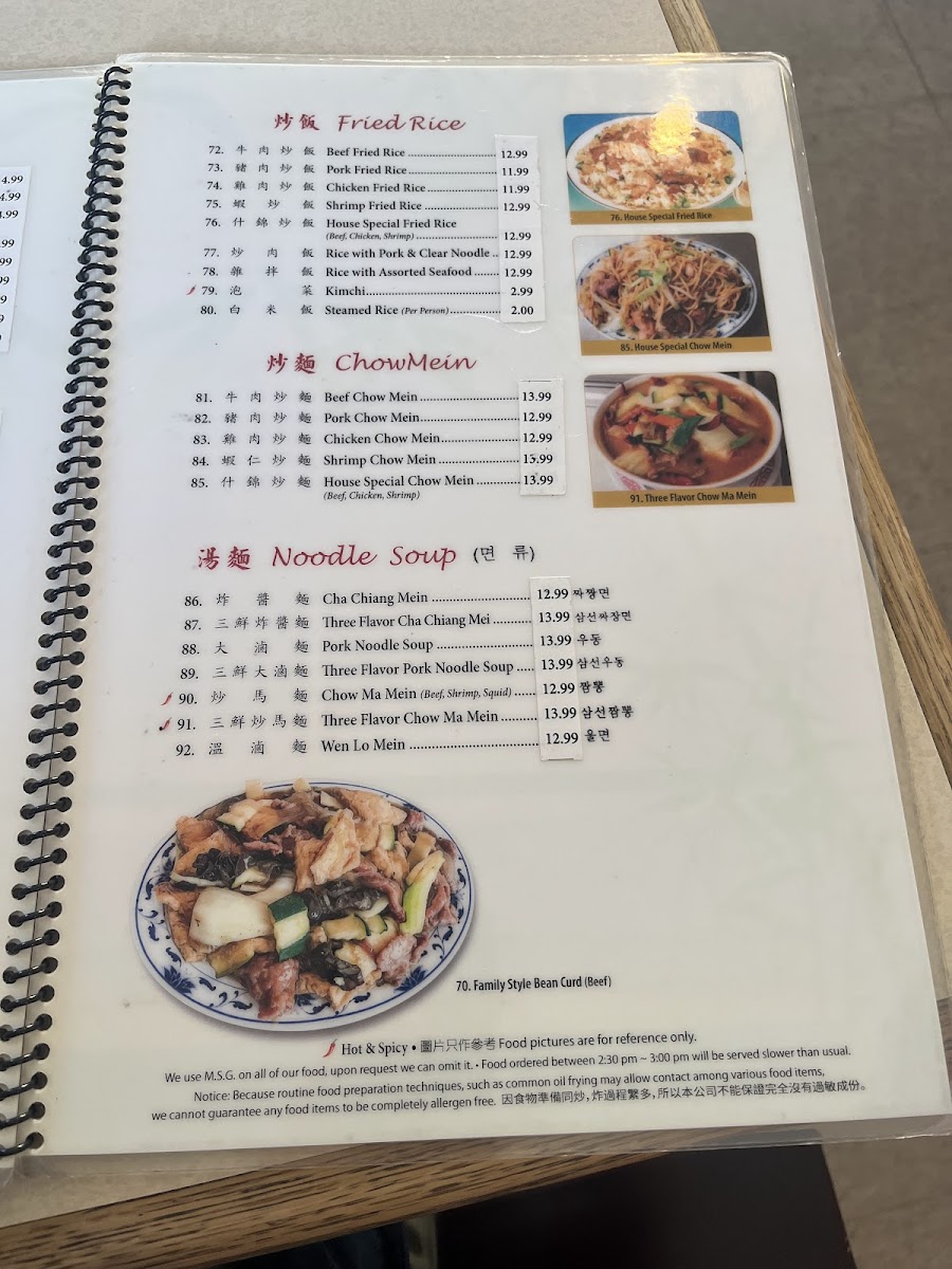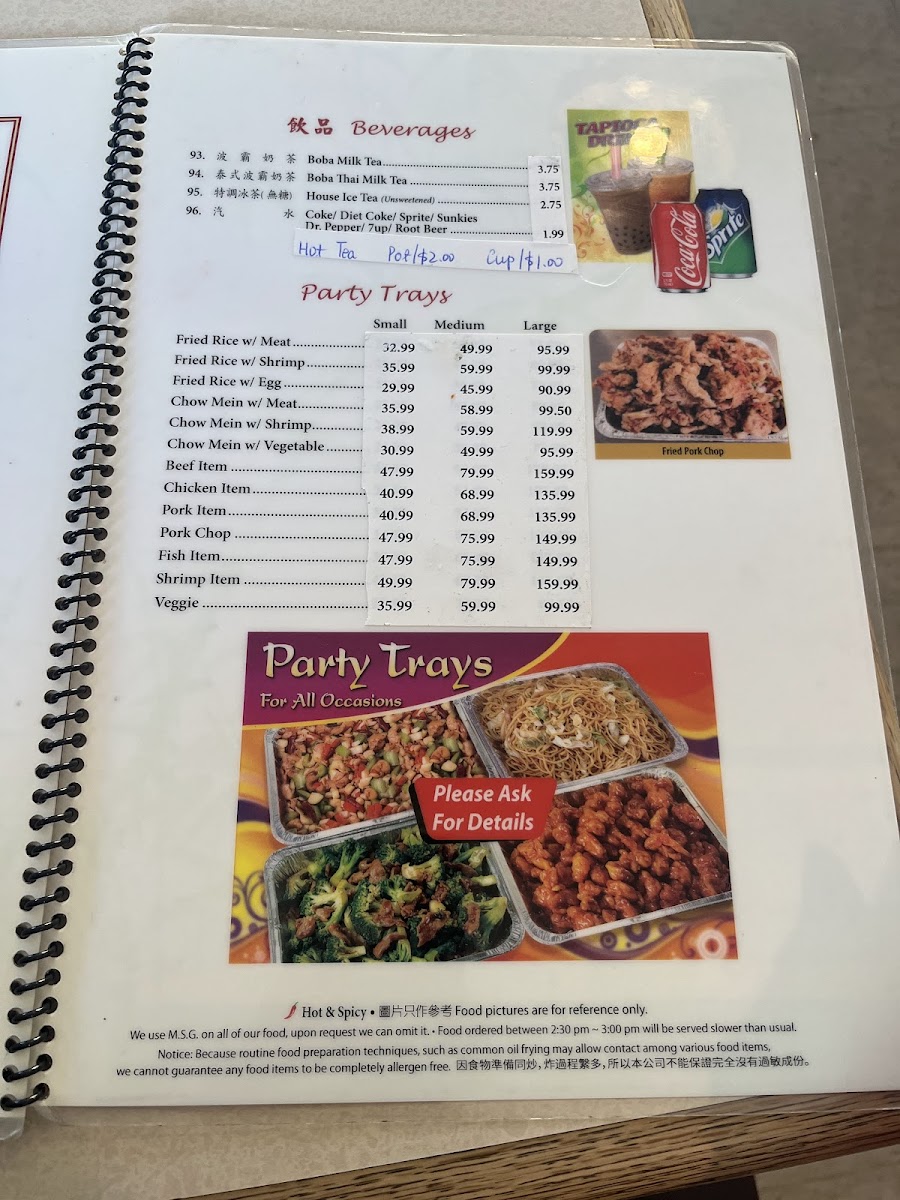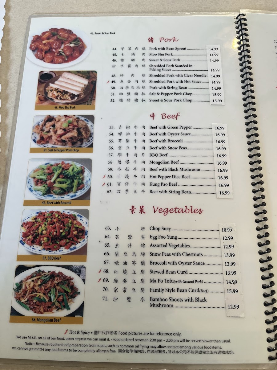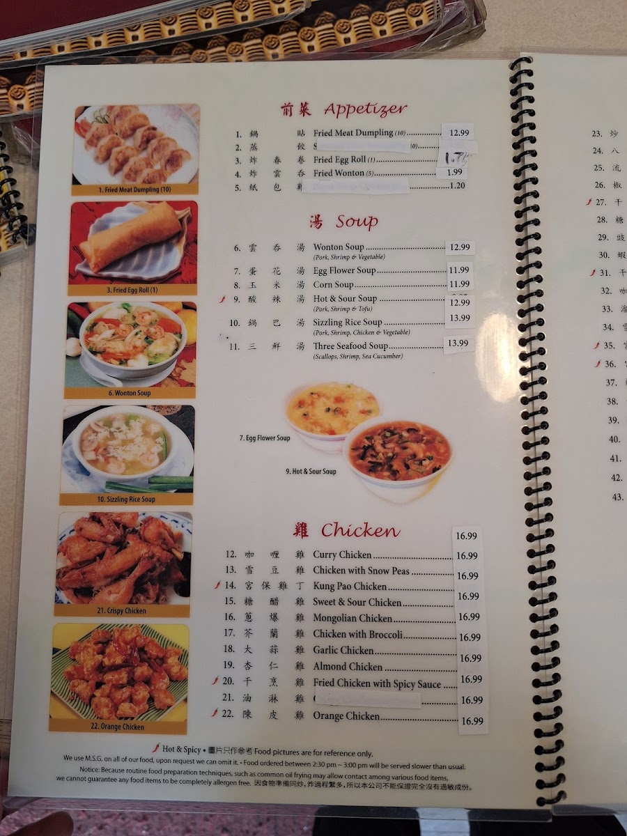 In addition to these main dishes, the menu features popular entrées like Mongolian Beef, Orange Chicken, Kung Pao Chicken, Beef Broccoli, Almond Chicken, Sweet and Sour Shrimp, and Mapo Doufu. Soup options include Hot and Sour Soup, Egg Flower Soup, Wonton Soup, and Chicken Soup. Light bites and appetizers include Fried Pork Dumplings and Crab Rangoon.