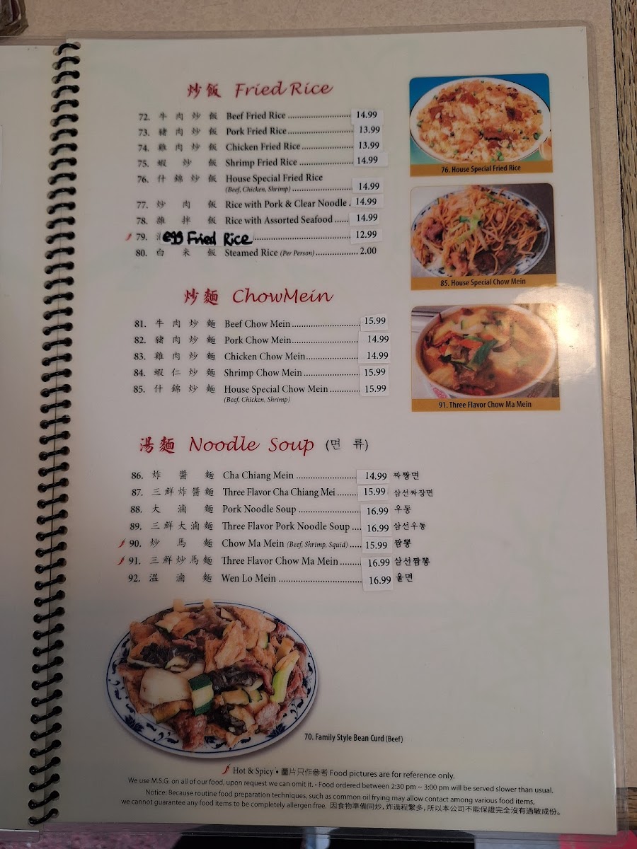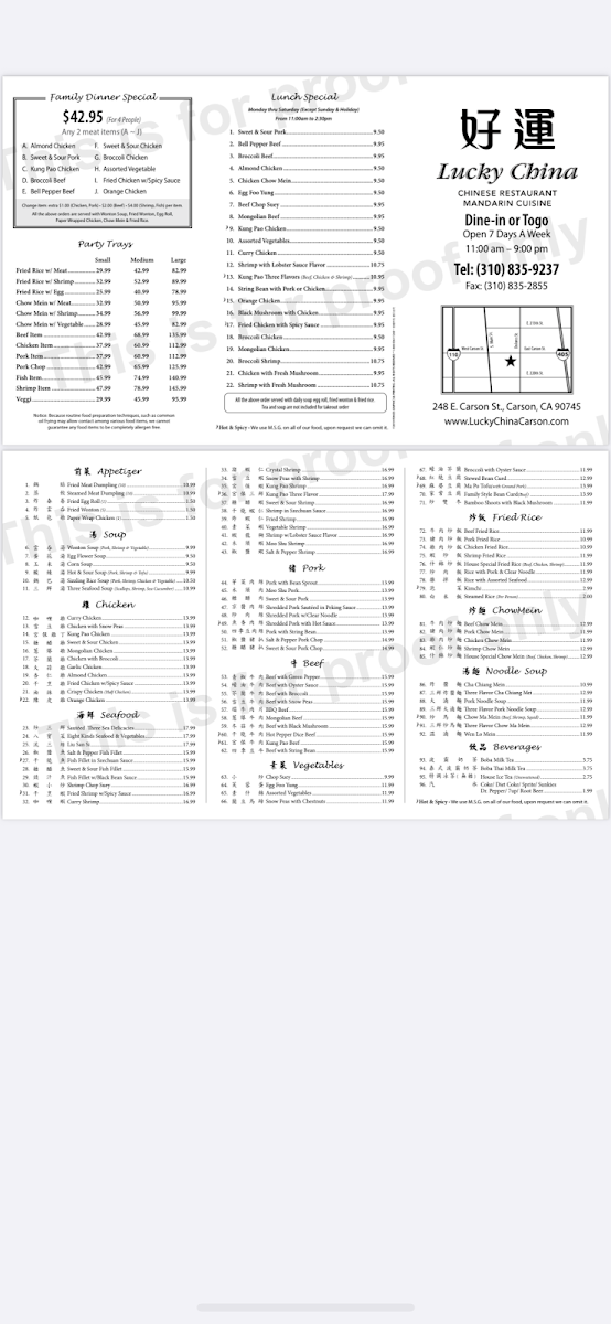 The menu at Lucky China offers a variety of Chinese dishes organized into several key categories. The food selections include a diverse range of fried rice options such as Chicken Fried Rice, Shrimp Fried Rice, House Special Fried Rice, and Rice with Pork & Clear Noodle. Several chow mein varieties are available, including Beef, Pork, Chicken, Shrimp, and House Special Chow Mein.